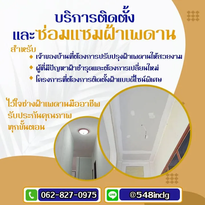 - ช่างทำฝ้าเพดาน ใกล้ฉัน ค้นหาเราแล้วติดต่อเข้ามาได้ทันที ยินดีดูแลเรื่องฝ้าเพดานทั่วไทยทั้งในกรุงเทพฯ ปริมณฑล และต่างจังหวัด